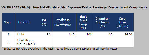 PV1303非金屬材料汽車內部空間里結構件光照射試驗 中氙燈老化測試的循環參數設置如下: