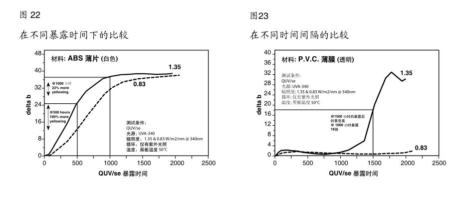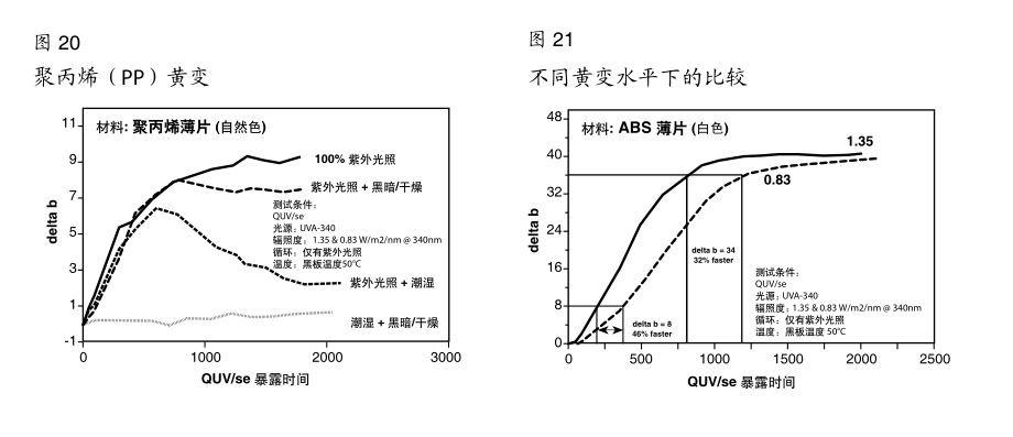 圖21顯示了以預期降解水平(在本例中,是發生黃變)進行暴露試驗會引起混淆。如果在delta b的值達到8后終止暴露,較高輻照度的暴露將會加快48%。如果在delta b的值達到34后終止暴露,較高輻照度將只加快32%。只有進行該試驗直到材料完全失效,才能完整地確定兩個暴露之間的關系。