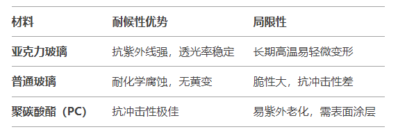 優先選用添加紫外線吸收劑(UV stabilizer)的亞克力,如“抗UV級PMMA”。