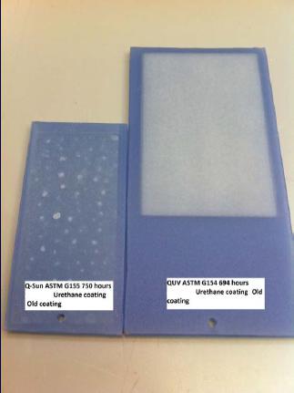 在QUV測試中,涂層出現細微變化,但是在Q-SUN測試中找不到這種變化